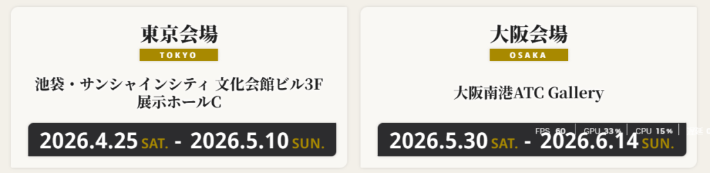 - 東京会場(池袋): 2026年4月25日(土) 〜 5月10日(日)